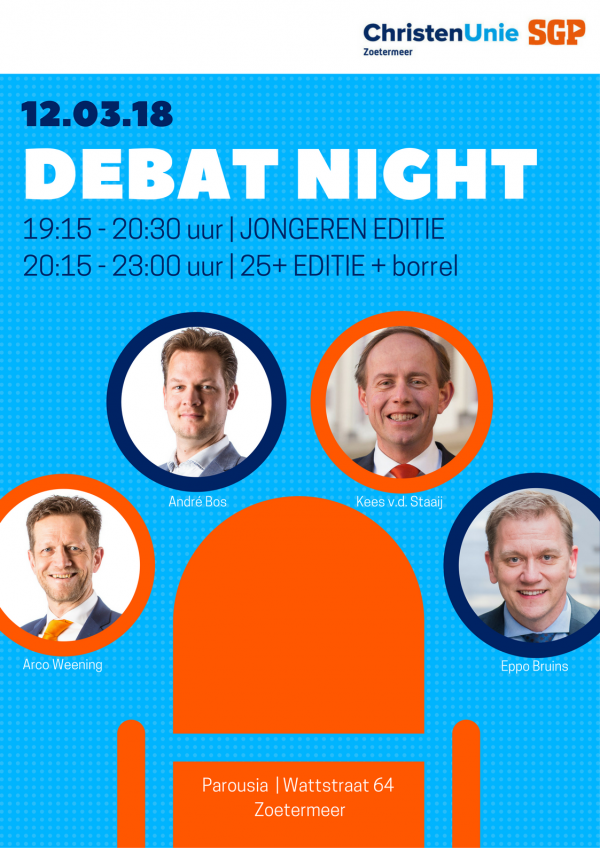 zaterdag 24 februari 2018 19:49 De ChristenUnie-SGP organiseert op maandag 12 maart een Debat Night in Zoetermeer, voor iedereen die zich wil verdiepen in de gemeenteraadsverkiezingen. Speciale gasten tijdens deze avond zijn de Tweede Kamerleden Kees van der Staaij van de SGP en Eppo Bruins van de ChristenUnie. Namens de ChristenUnie-SGP fractie in Zoetermeer nemen lijsttrekker André Bos en #2 op de kieslijst Arco Weening deel aan de avond.